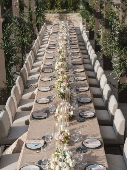 Pair with: Taper candles, gilded chargers, and florals like anemones, orchids, and deep greenery. Velvet lounges or marble details elevate the vibe even further.